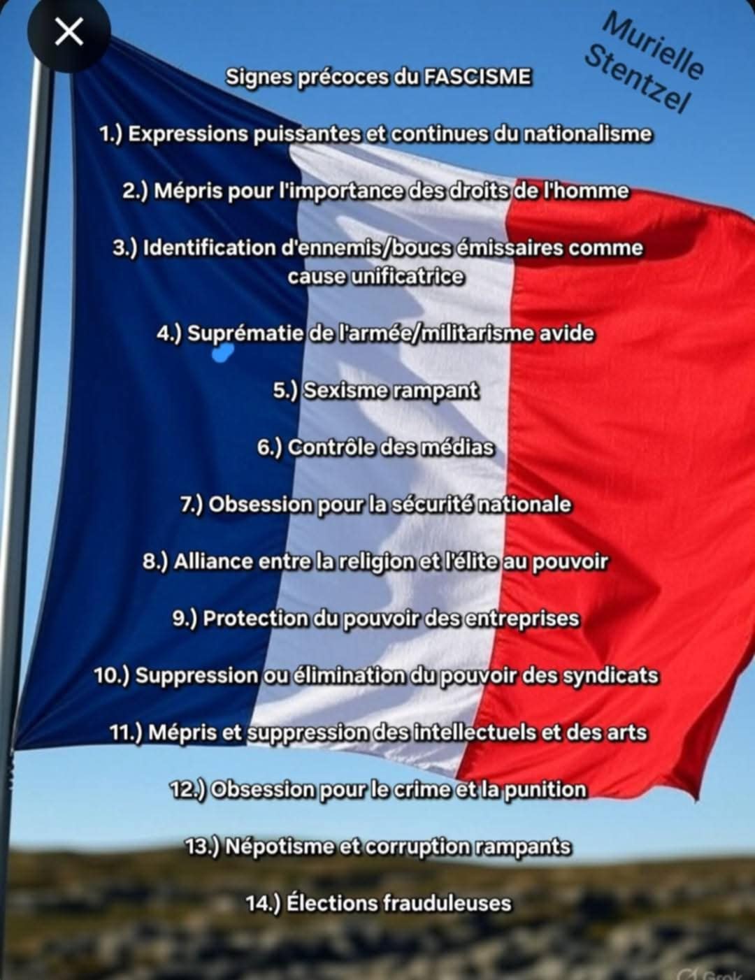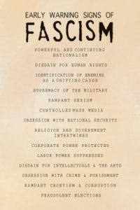 – Si vous vous rendez au Musée américain de l’Holocauste, vous verrez une affiche qui vous indique les signes à surveiller si vous craignez que votre pays ne sombre dans le fascisme. Examinons les douze signes avant-coureurs du fascisme qui y sont mentionnés. (voir l’image à la fin de l’article)- et je l’ai traduit en Français.