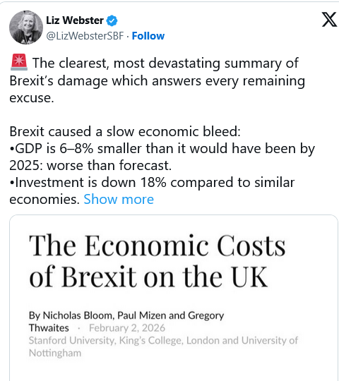 Pendant une décennie, les défenseurs du Brexit ont insisté sur le fait que les avertissements étaient exagérés et que les difficultés seraient temporaires. Les dernières données montrent le contraire. Le Brexit n’a pas été un choc ponctuel suivi d’une reprise : il a discrètement et inexorablement sapé l’économie britannique année après année.